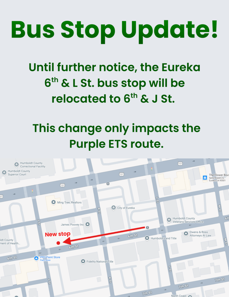 Bus Stop Update! Until further notice, the Eureka 6th & L St. bus stop will be relocated to 6th and J St. This change only impacts the Purple ETS route.