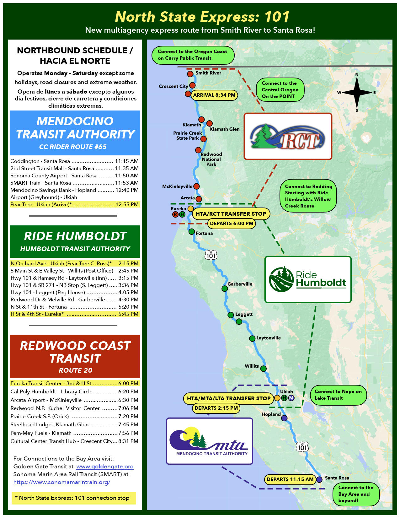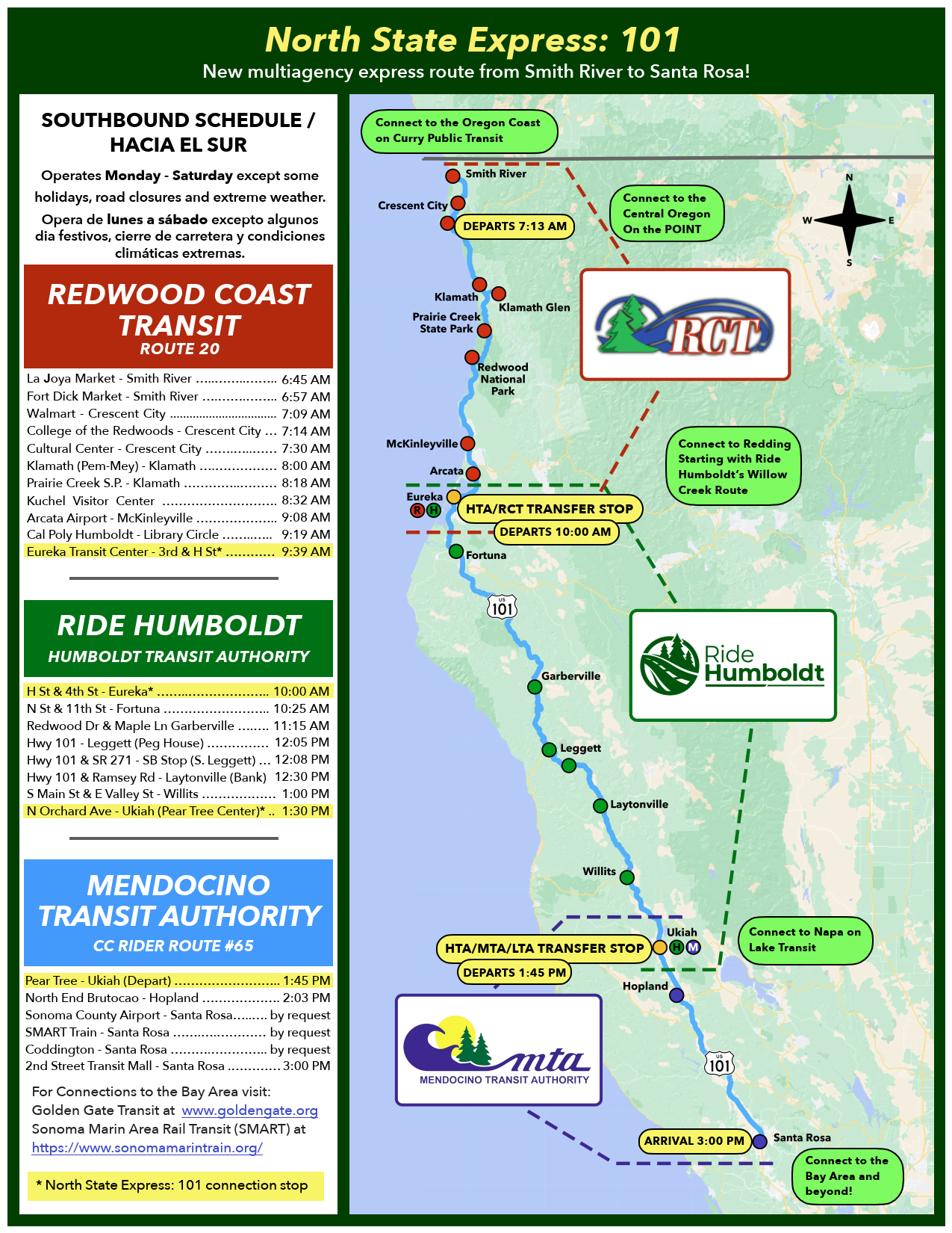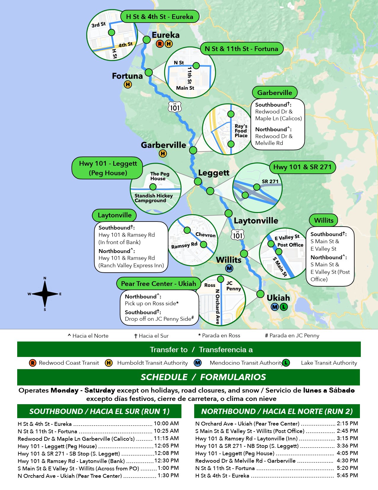 Connect to Crescent City on Redwood Coast Transit and to Santa Rosa via Mendocino Transit.