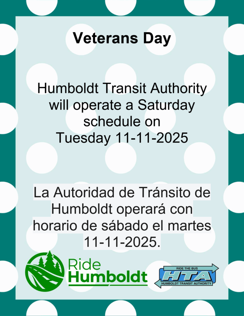 Veterns Day Posted on: November 3, 2025 Humboldt Transit Authority will operate a Saturday schedule on Tuesday 11-11-2025.
